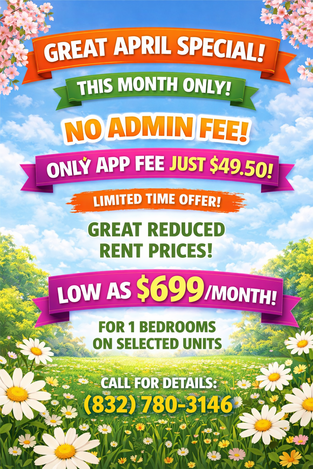 Apply now and enjoy our limited-time fees: π Application Fee: Only $49.50 π’ Administration Fee: $0 π‘Reduced Rent 1 Bedrooms Selected Units